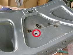 | その答えがこちら。 実は、ここでオーナーとの相談の結果、MK−I仕様で仕上げる事に変更になりました。 上で溶接していたのは、トランクの穴埋めを行っている所。 MK−I仕様にするにはトランクの穴埋めが必要となり、大小合わせて10個の穴を埋める必要があります。 小さい穴は溶接だけで埋めることが可能なのですが、大きい穴(赤丸の中)3個は鉄板を宛がい溶接を行います。 その後、キレイに研いで仕上げていきます。 |