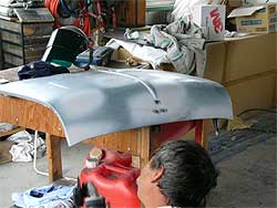 | ボンエット&トランクは、ほぼ作業終了。 細かい傷は拾い終わり、この後全体にサフェーサーを吹き塗装となります。 白い部分が傷の修正を行い、一旦サフェーサーを入れた部分です。 |