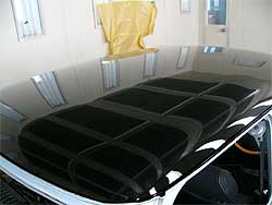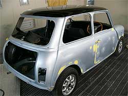 | その頃、ボディはルーフの塗装が完了。 先ずルーフを仕上げ、その後にボディを仕上げていくのですが、一旦ここで塗装ブースから出る事となりました。 |