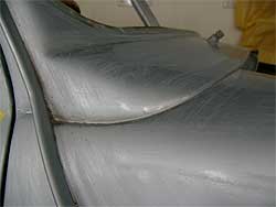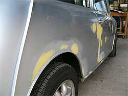 こちらが研いでいる途中のカットです。 右リアフェンダーのパテが薄くなってきているのが解るでしょうか? 根気良く研ぎ、極限まで少ない状態でパテがのっている状態にします。 パテの厚塗りで誤魔化す仕上げは最悪。 それは、見せかけだけであり、後にパテが浮いて塗装剥がれや錆びの原因となります。 仕上げに時間の掛かる作業です。 |