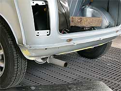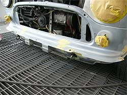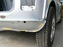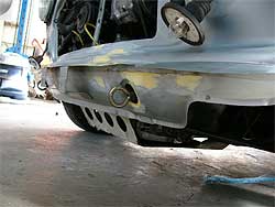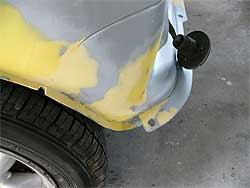 | 下の写真にあるように、フロントスカート、リアのエプロンも傷や錆びをキレイに拾います。 黄色いパテのある部分が修正した箇所。 こちらも、この後キレイに研ぎあげていきます。 |