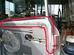 こちらは、ドア内側のカット。 赤線で囲んだ部分の塗装が剥がしてあるのが解りますか? ここは、シートベルトの金具が当たり、傷が付き易い場所。 この車輌も、ここに傷がありました。 そこで一旦塗装を剥がし、再度下地を作ります。 |