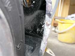 | 前回に紹介した右フェンダーのヘコミがあった部分です。 パテはまだ研ぎ上げる前の段階。 右の写真は裏側から見たもので、少し解りにくいですが、板金でキレイに成型しています。 板金で出来る限り成型し、パテは少しでも薄く。 |