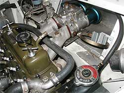 | まずは、レーシングカーとしての現在の姿を紹介します。 エンジンはフルチューニングのレーシング・エンジンに載せ換えられ、ボンネットはファイバー製に変更。 左下の写真では解りにくいですが、フロントパネルもボンネット・キャッチ部分はカットされています。 また、右下の写真にあるように、ウェーバー+ロングマニホールドを納める為、バルクヘッドを切断しキャブBOXを取り付け。 レーシングカーですから、エンジンルーム内の余計な物は全て取り除かれています。 |
