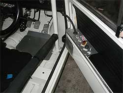 | 室内もご覧の通り。 当然、カーペットや内張りなどというものは存在しません。 ロールケージが張り巡らされ、レーシングパネルを作成したパネルには必要最小限のメーター類。 ドアポケットには、各スイッチ類が取り付けられています。 |