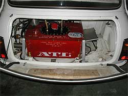 | トランク内も大きく変更されています。 まず、左右の燃料タンクは取り外し、中央にレース用安全タンクを装着。 トランクフードはもちろんファイバー製です。 また、右下の写真では解りにくいですが、純正タンクを取り外した穴はアルミ板をリベット留めで塞いでいます。 更に軽量化の為に、フロントガラス以外は全てアクリル板に変更です。 |