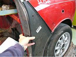 ここから、同時にボディ側の作業も行っていきます。 まず右のフェンダー、ドアの取り付け部から。 写真はパネルが剥がされた状態のもの。 何故、ここまでパネルを剥がすのか? やはり、そこにはMK−Iとのパネル形状の違いがあるのです。 |