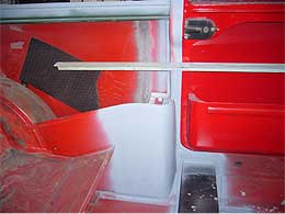 | 室内側も作業は進み、ご覧の通りメンバー&追加メンバーもキッチリと完成。 グレーのサフェーサーが吹いてある部分が溶接を行なっていると思ってください。 フロアの補強の鉄板の位置も良く解ると思います。 ワークスカーと同じ補強の仕方ですが、どこまで強度が上がるのだろう? |
