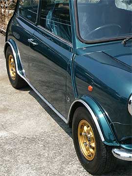 | レーシンググレーンのボディカラーにゴールドのホイールの組み合わせ、珍しい組み合わせではないですが、一般的にはシルバー系か黒系の組み合わせが多いので、新鮮に感じませんか? あまり太いサイズを選択しなかったのと、メッキモールを取り付けてセットアップしたことで、上品に見えますね。 いかがですか? こういった楽しみ方が出来るミニっていいですよね。 |