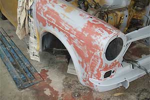 | エンジンの大まかな紹介が出来たところで、ボディ側の作業へとまいりましょう。 それほど大きな錆の出ていた外装ではないのですが、フロント回りが何箇所か気になる&ちょっと早めのお手入れが必要かな?という箇所がありましたので、きれいに仕上げ治すことにしました。 まずは錆の出てきていた箇所をキレイに剥いて錆落とし。 腐りが酷くて・・という箇所はありませんでした。 |