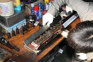 | 走行距離は10万キロを越えた1.3ATエンジンです。 今回、オーバーホールとなったのは、ヘッドガスケットが抜け気味でトラブルが出始めていたこと。 以前から「10万キロ超えたらオーバーホールを考えましょう」という話しにはなっていましたので、まずはヘッドを剥がして状態確認して・・という事になりヘッドを外したのが上の写真。 3番のエグゾースト側バルブが熱で溶けてしまっています。 2−3番間のガスケットも吹き抜ける直前という状態でした。 オーナーも「15年乗っていますし、いいタイミングなので全部きっちりオーバーホールでお願いします」ということで、全てばらしてきっちり仕上げることとなりました。 |
