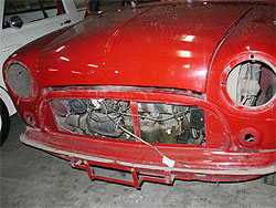 | フロント、リアのカットです。 フロントについては、ほとんどの部品が外れています。 リアは、テールレンズ、ガソリンタンクは外れていますが、ライセンスプレート、トランクハンドルが残っています。 もちろん、板金・塗装の時には、トランクは外して塗る事となります。 |