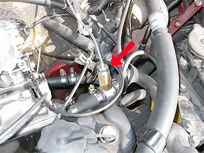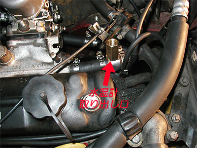 ヒーターホースへの接続口には、水温計の取り出し用アダプターを付けます。