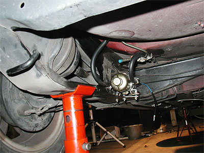 ミツバ製の電磁ポンプをリアのサブフレームに取り付けます。(左の写真)