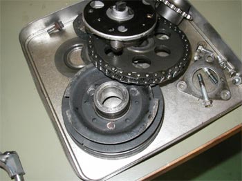 右下の写真のタイミングチェーン(カムを駆動してます)は、強化品(ダブルチェーン)に交換となります。