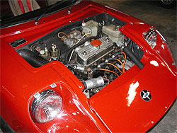 | この車のポイントはエンジン。 マーコスはキットカー(組み立て)ですから、それこそ様々なミニのエンジンが搭載されています。 このマーコスはミニのエンジンの中でも最強のユニット、クーパーSの1275ccのエンジンをチューニングし、1380ccにしたものが載っています。 しかし、今のままではキャブも小さく、本来の力を発揮出来ません。 今後、どのようにセットアップしていくか楽しみです。 |