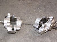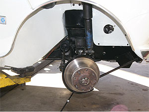 フロント・サスペンションでは、ブッシュやブーツ類のチェックはもちろん、ハブベアリングは交換、ブレーキキャリパーもオーバーホールを行います。 サスペンションは、COOPER−Sの特徴でもあるハイドロラスティック。 ユニットの点検はもちろん、液の補充も行いました。 写真のショックは後付けで付けられたものです。 |