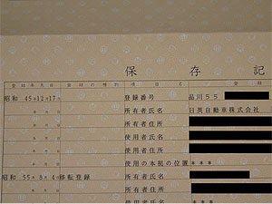 この車輌の保存記録。 いつ、誰が登録したか解るものです。 昭和45年(1970年)12月17日、当時のディーラーであった日英自動車によって登録されました。 しかし、ディーラー(日英)登録の1号車より製造番号は若く、ほんとの初期に輸入された事が解ります。 また、現在までに4オーナーですが、3オーナー目から4オーナー目は親戚に譲渡されているので、実質は3オーナーと一緒です。 オールド・ミニでは、こういったヒストリーも重要となってきます。 |