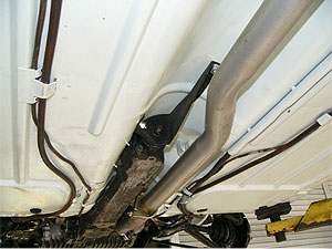 リモートミッションの証でもあるコントロールBOXが良く解るカット。 左右の太いパイプはハイドロ用の配管です。 細い方の左が燃料ライン、右がブレーキラインです。 ブレーキラインは漏れはないのですが多少腐食があるので引き直します。 |