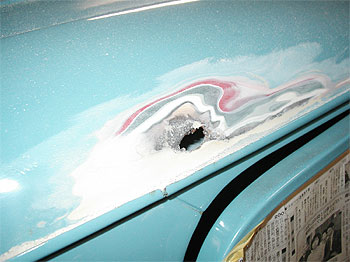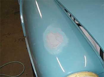 | 他には、ポンネットエンブレム、フェンダーミラーの穴も埋めていきます。 穴に合わせて鉄板を溶接し、錆び止め処理をして仕上げていきます。 |