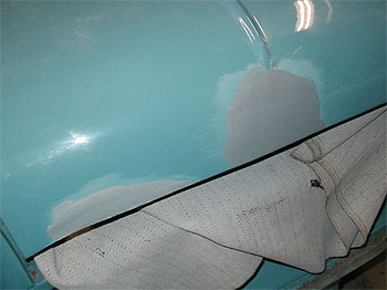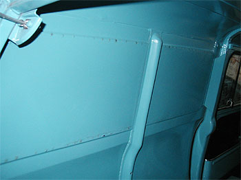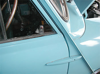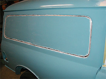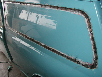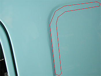 | 最後にサイドのパネル部分です。 この車輌は、以前パネルを抜いてガラスを入れていたようで、その後、再度パネルを貼り塞いであります。 しかし、その取り付け方が悪く、接合部に亀裂が入っていました。 写真では解りにくいのですが、赤線で囲んだ中に亀裂が走っています。 |