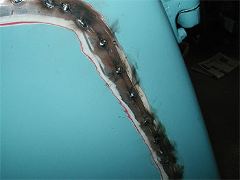 | 今回のポイントでもあるサイドパネルを研いで接合部を出していきます。 銀色に部分は、鉄板が剥き出しになっている部分です。 研いで見て解ったのは、パネルが点付けで溶接してあるだけだったという事。 これでは、振動で直ぐに剥がれてしまいます。 |