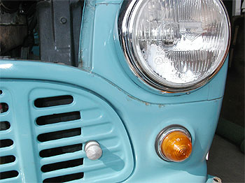 | 九州での1カット(見づらくてゴメンナサイ)ですが、これが元の状態です。 ボディはサーフブルー、スチールホイールにホイールキャップ、フェンダミラー。 内装は3連センターメーターにウッドパネルとなっています。 この時点でボディは錆び取りを行う予定でしたので、1960年代のワークスカーのイメージで仕上げる事にしました。 下の写真は、ホイールをCRホイールに履き替えた物です。 |