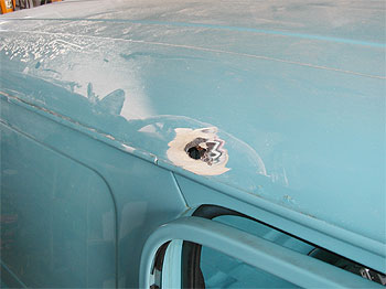 | ルーフ周りも錆びが浮いてきています。 そして、下の写真の箇所は、錆びを落としていくと貫通していました。 前回の錆び処理の仕方が悪かったようです。 写真以外の場所でも錆びが浮いている箇所がありました。 |