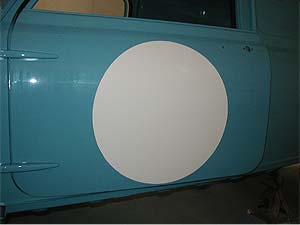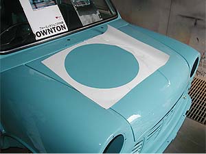| 全体の塗装、研ぎが終了した時点で、追加の塗装を行います。 今回、お客様の要望により、ボンネット&ドアにゼッケンサークルを塗装で入れる事になりました。 ルーフもOEWで塗り替えますので、サークルにも同じOEWを使用します。 まず、カッティング・シートを円形にくり抜きマスキング。 位置はワークス・カーの写真を参考にします。 |