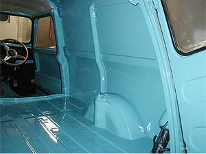 | 細かい部分も見て見ましょう。 室内は、予算の都合で今回は手を付けていません。 しかし、サイドパネルの処置を行っている為、カーゴスペースは色を入れています。 右下の写真を見ると、作成した水抜き穴が良く解ります。 |
