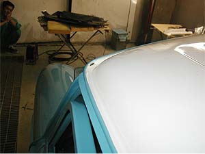 | PART2でサフェーサーの吹き終わったボディにいよいよ色を入れていきます。 まず、ボディカラーはサーフブルーのままなのですが、今までの色は場所により色褪せ等があり、新たに作り直しています。 まずはボディ全体に色を入れ研いでいきます。 |