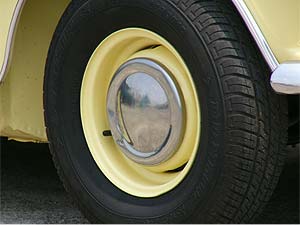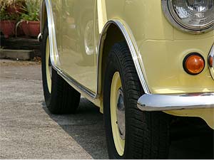 ホイールはオリジナルの3.5Jスチールホイールを全て剥離し、ボディ同色で仕上ました。 ホイールキャップも取り付けることで、ミニらしさが良く出ている部分でもあります。 |