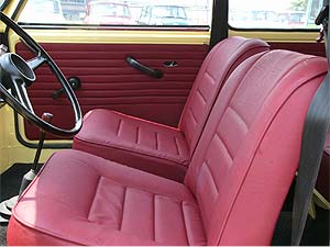 ボディを仕上るにあたり、内装も全て張り替えています。 写真はフロント・シートです。 シートカラーは少し濃い赤とし、レザーで新しく張り替えました。 ヘッドレストは好みで着脱可能としています。 内張りもシートと同じレザーで張り替えました。 少し絞りの入った、通常のレザーよりも高級なレザーを奢っています。 |