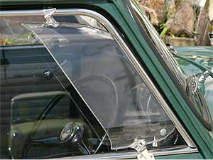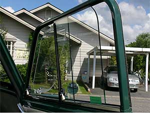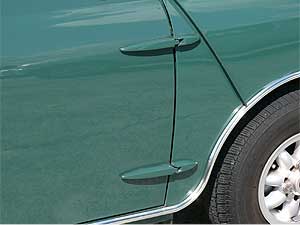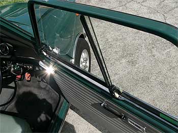 | MK−Iの特徴でもあるスライドガラスKITを装備したドア回り。 これだけで雰囲気はグンと変ります。 窓枠にはサッシュモールを付け、通称「ゾウの耳」と呼ばれるエアスクープも装備しています。 もちろん、取り付けは丁寧に行っていますので、雨漏り等もまったくありません。 スライドガラス化に合わせ、内張りもレギュレーター用の穴の無い物に変更。 インナーハンドルもMK−IIIタイプに変更しています。 |