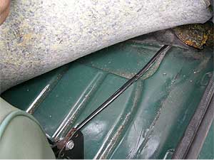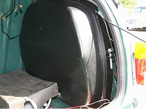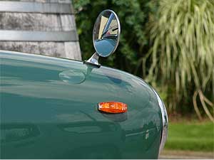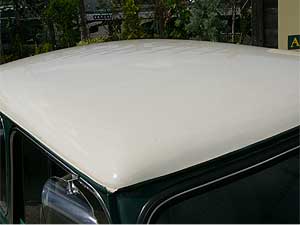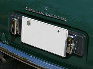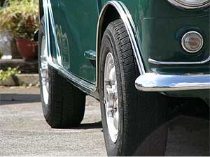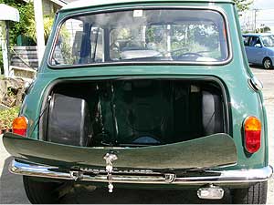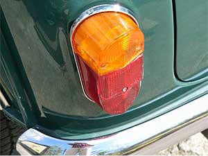 | まずは、ボディから紹介します。 アーモンド・グリーン/オールド・イングリッシュ・ホワイトにオールペイントされたボディは、錆びや腐りは無くベストな状態です。 塗装もキレイで良い状態なのですが、艶々ではなく多少艶を落としており、雰囲気のある色合いとなっています。 フロントグリル、テールランプはMK−I仕様に変更しているのですが、取り付けには板金・加工が必要となります。 ここで丁寧に仕上げるかどうか?によって、永く良い状態を保っていられるか?という事が変ってきます。 特にMK−Iテールを取り付けるためのプレートは重要。 もちろん、この車輌は丁寧に板金・加工を行っています。 |