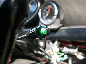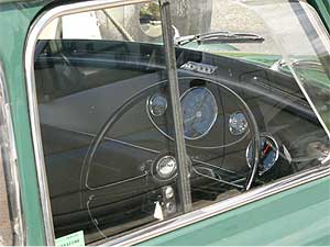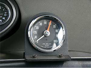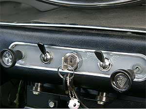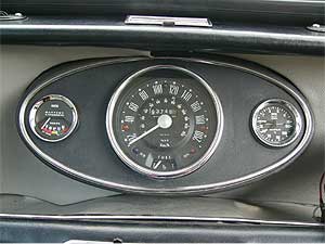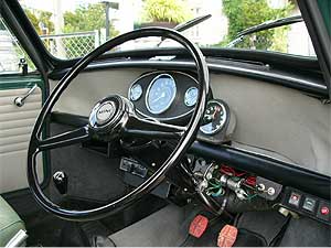 | インテリアもMK−I仕様で仕立てています。 3連センターメーターには電圧計、そして水温&油圧のデュアルゲージを選択しました。 スミス製10000rpmタコメーターも装着済み。 センターキーも加工・取り付け済みで、プレートは当時のMK−Iの物をリビルトして使用。 パネルもMK−Iサイズに合わせ加工しています。 上下ダッシュレザーを貼り、クーパーSのイメージを再現し、MK−Iタイプのシフトノブ、ステアリング、インジケーターレバーも取り付けています。 インジケーターは飾りではなく、先端が光るように配線加工。 細かい所まで手間暇を掛けて仕上げています。 |