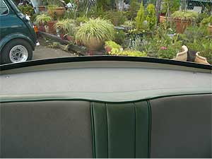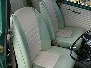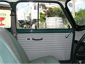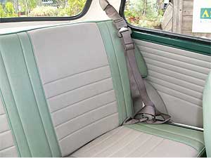 | インテリアでは、シートも全てMK−Iタイプに変更。 クーパーSにオプションであったハイバックタイプのフロントシート、そして、リアは同じくグリーン/グレーのシートカバー。 内張りも全てグレーレザーで統一しています。 また、カーペットもグレーで張替え。 細かい所ではルームランプをMK−Iタイプに変更しています。 |