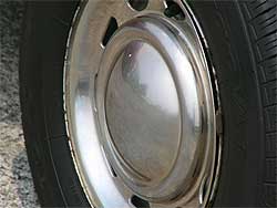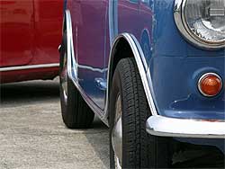 | エクステリア全体ではオバーフェンダーを外しフェンダーレスとしています。 もちろん、オーバーフェンダー用の穴は全て板金により穴埋め加工。 メッキモールと合わせ、ミニ本来の可愛らしいスタイルとなっています。 また、ホイールはスチールホイールにワンプレスのキャップを被せ、センス良くまとめてみました。 |