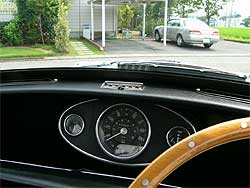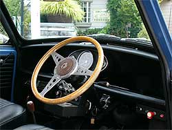 | インテリアも基本的にMK−IIクーパー仕様となっています。 ステアリングはミニでは定番のモトリタウッド。 MK−IIコラム&インジケーターに3連センターメーターを装備しています。 またダッシュレザー、デミスターベゼル、ピラーレザーも貼り付け。 ノーマルからはガラっと変り、雰囲気のあるインテリアにまとまっています。 |