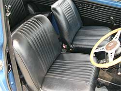 | シート、インテリアは全て黒で統一し、ブラックレザーで張り替えています。 MK−IIクーパー仕様には、やはり黒レザーが似合います。 また、フロアカーペットをめくってみても錆びも無く、エクステリアと同様に良い状態です。 |