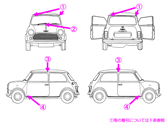 | AUSTIN COOPER MK−II仕様 ボディ オールペイント 全体に錆びも無く、キレイなボディです。 @ルーフ水抜き穴 板金加工(MK−II型) Aワイパー中央寄せ加工 Bルーフドリップレール取り付け Cドア下アール加工 |