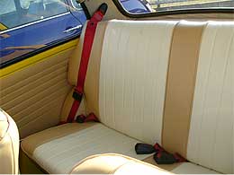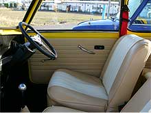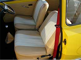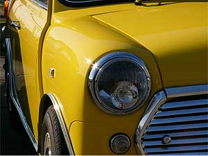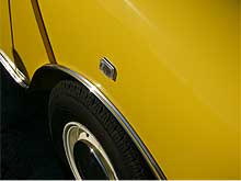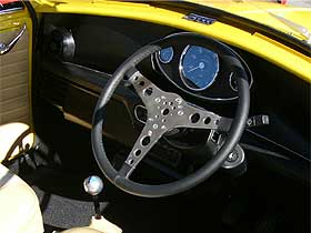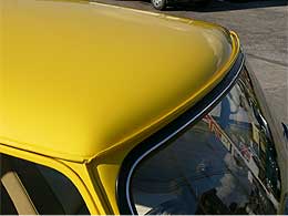 | 少々、派手目なイエローですが、それでも雰囲気はしっとりしたカラーに仕立てています。 全体のイメージとしてオーバーフェンダーレスとし、各穴は丁寧に板金処置しています。 メッキパーツ類は、バンパー、ライトリム、フェンダーモールなどNEWパーツを使用。 ヘッドライトには、リプロダクトですが、ダブル反射(通称ミッキーマウスの目。 可愛らしく見え、高価なライトです。)を贅沢にも奢っています。 | ![]() |