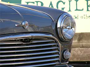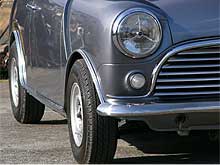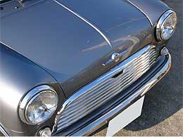 | グリルやエンブレムもNEWパーツにてリフレッシュ。 グリル周りやフェンダーのビス穴は板金にてキレイに埋め、フェンダーレスのミニらしい、雰囲気の良いスタイルで仕上げました。 3ポイントヘッドライトや10インチ・クーパーSタイプアルミホイールでセンス良く、そしてカッコよくまとめています。 |