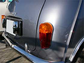 フロント同様、テール回りもMK−I仕様にて作成。 ライセンスランプやテールレンズ、エンブレムとNEWパーツを多数使用。 MK−Iテールに変更するには、レンズの取り付け部にプレートを溶接して仕上げるのですが、仕上げが裏から見てもキレイに行われているのが解るでしょうか? 手間暇かけて仕上げています。 |
