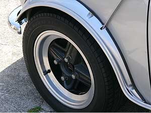 | 5.5J同色オーバーフェンダーにメッキモール、そしてブラックのレボリューションを履く足回り。 レボシューションも、近頃は入手がだんだん難しくなってきましたね。 |