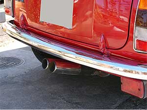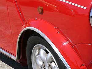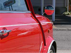 | エクステリアに関しても、基本はオリジナル。 しかし、純正のオーバーフェンダーはボディ同色タイプに変更し、メッキモールを取り付けています。 これだけでも印象はかなり変りますね。 また、ミラーは定番であるルーカスタイプノフェンダーミラーに。 そしてミニでは人気のあるセンターマフラーは、ペコのW出しとしています。 また、ボディについても錆び取りペイント済み。 写真で見てもボディに歪みも無く良い状態であるのが解って頂けるでしょう。 |