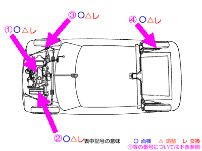 | @消耗品交換 油脂類交換 点火系(コイル、キャップ、ロータ)交換 キャブレター点検調整 ステディーブッシュ交換 点火時期調整 クラッチ油圧系点検 A水回り(ラジエター、ウォーターポンプ、ロアホース)交換 クーラント交換 Bサスペンション各部点検整備 ロアアームブッシュ交換 テンションブッシュ交換 ステアリングラックブーツ交換 Cブレーキ各部点検整備 |