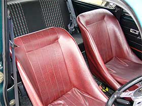 | シートは、フロント2脚をローバックタイプに変更。 カラーもあえてブラックではなく、ワインレッドの物を選択しています。 クロームのドアハンドル類も装備し、さり気無くポイントを押さえた変更をしています。 |