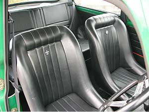 インテリアも、少しだけレーシーに仕立てました。 フロントシートは2脚ともコブラ・ローバックシートに変更。 ブラックレザーとなったフロントに合わせ、リアシートもブラックレザーカバーを取り付けています。 黒で統一した飽きの来ないインテリアです。 |