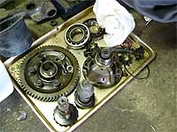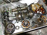 ミッションは全てバラし、各ギアの状態確認。 刃こぼれや磨耗があれば交換です。 シンクロリングは消耗品ですから全て交換。 デフ回りもバラし、状態を確認、メタルやワッシャーは交換します。 | |
